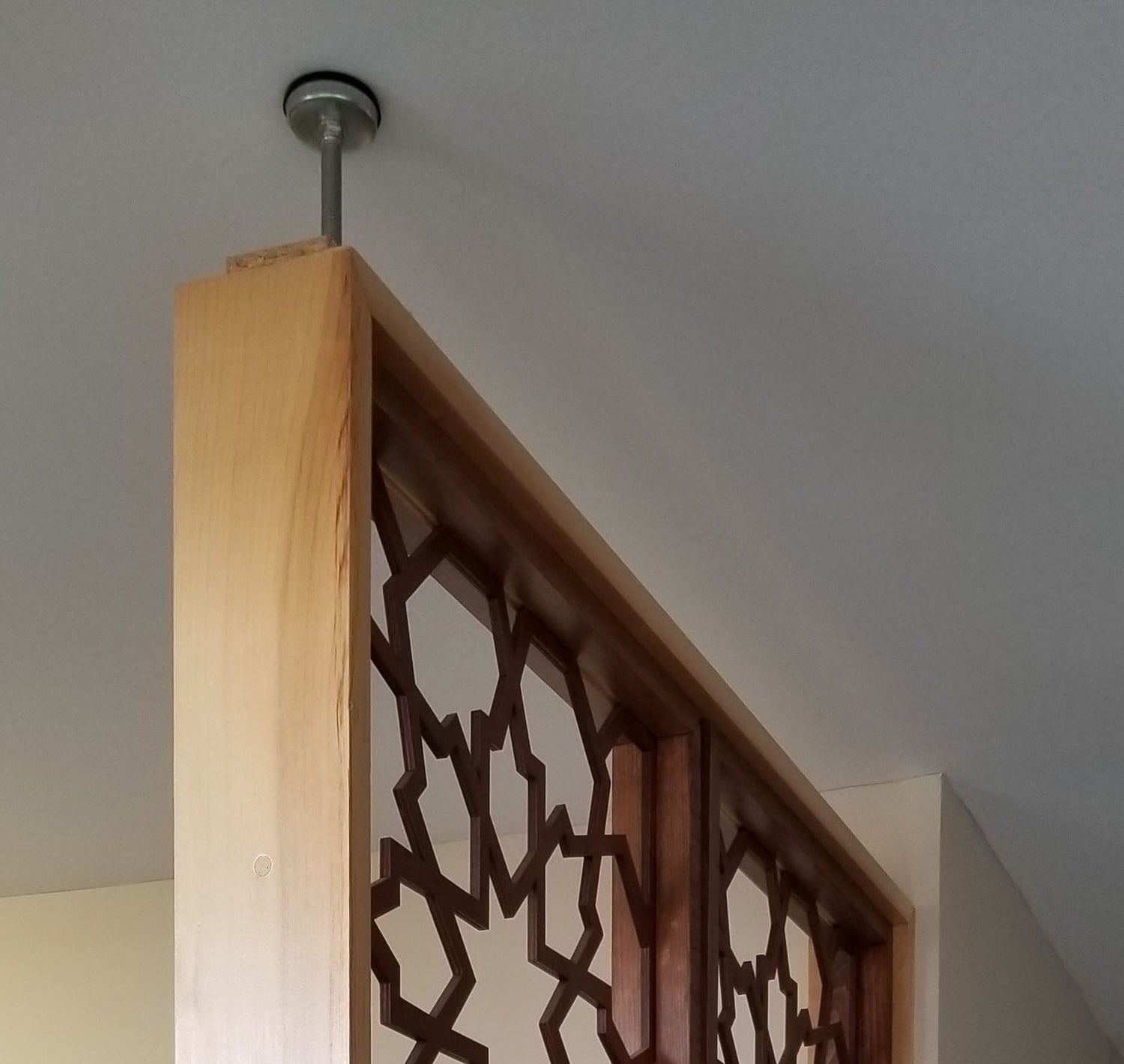 After fixing a framed screen panel to the floor and side walls, you can use adjustable legs/foot to secure it to the ceiling.