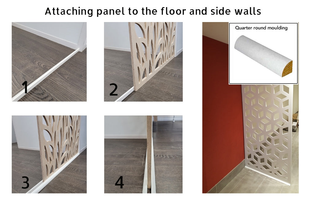 Secure one of the quarter mouldings to the ground with glue and screws. Attach your screen panel to the Moulding that is already secured to the ground. Lastly, attach another quarter moulding to the front of your panel making sure everything is tight. This should allow your panel to stand up freely and securely.