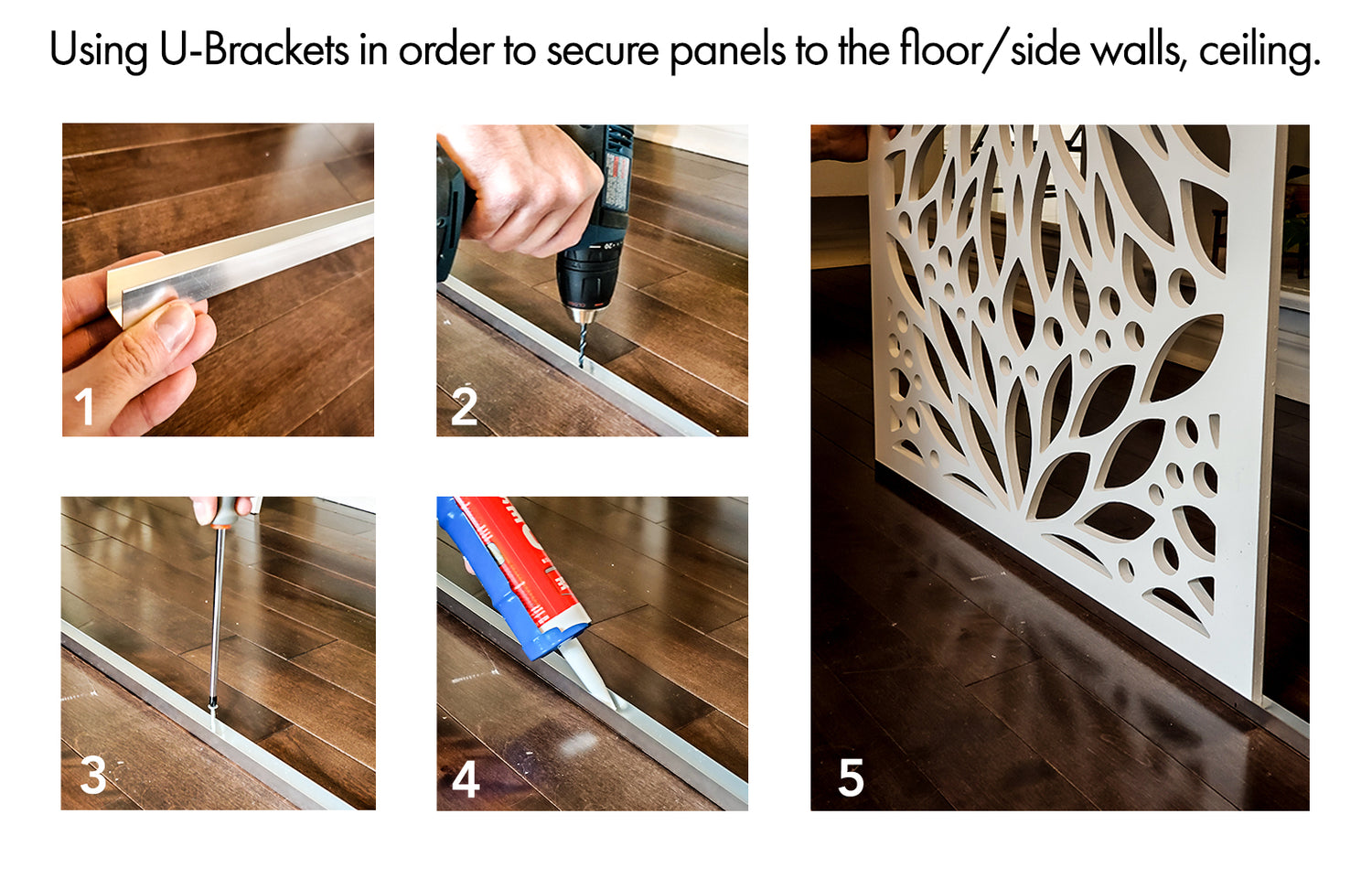 At first, you need to fix/screw the U-Brackets to the floor, Side walls, or ceiling, and then you will need to add some silicon glue or construction glue inside the bracket and insert the panel inside the U-Bracket.